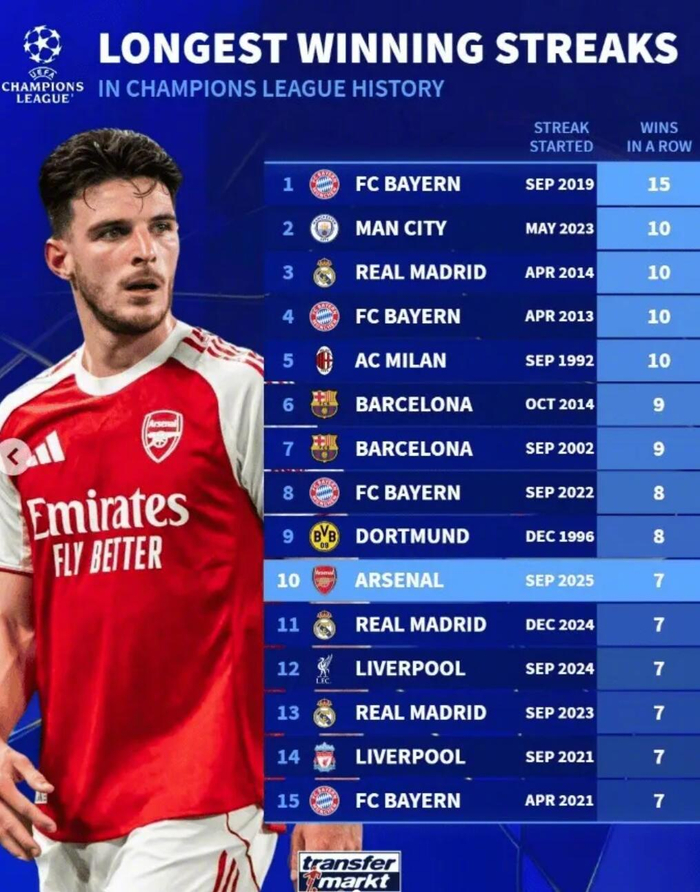 德国转会市场盘点了欧冠历史上最长的连胜纪录,详情如下: